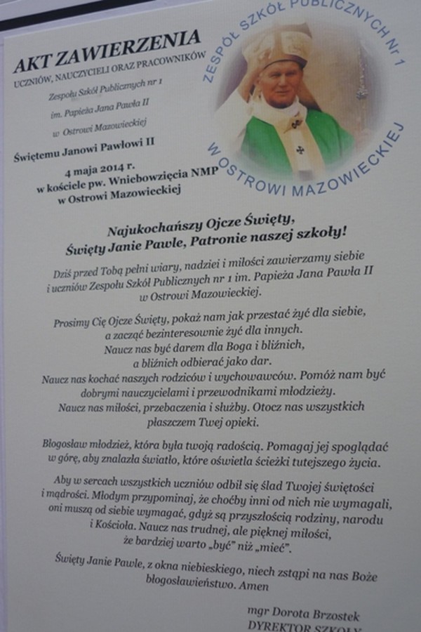 Ważnym elementem mszy był akt zawierzenia świętemu Janowi Pawłowi II Uczniów Nauczycieli i Pracowników Zespołu Szkół Publicznych nr 1 w Ostrowi Mazowieckiej przez panią dyrektor Dorotę Brzostek.