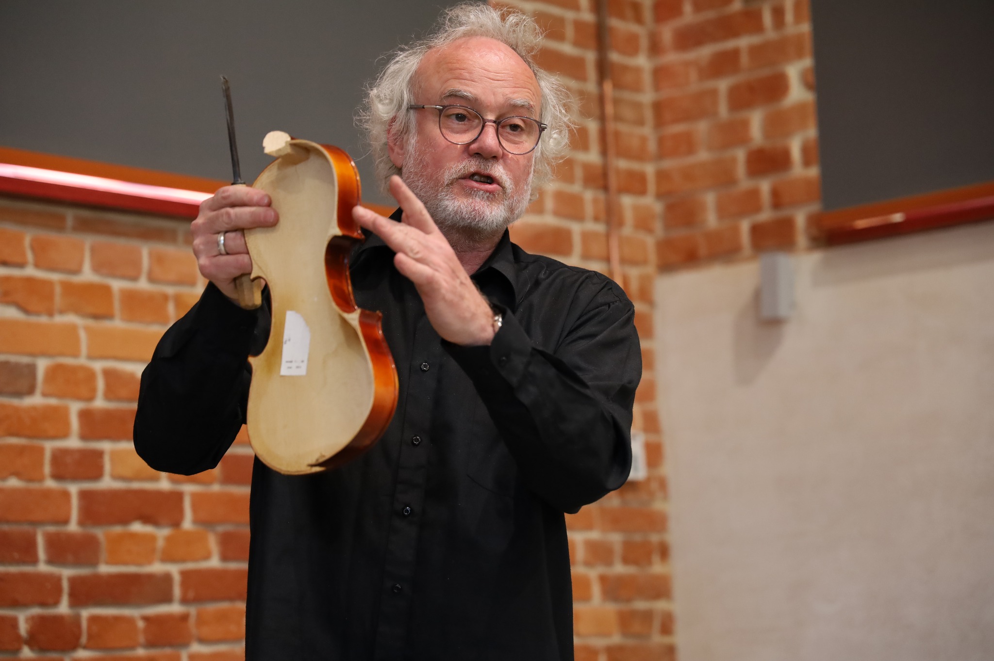 Prowadzący Bogdan Szczepański przybliżył uczniom zawód lutnika oraz pokazał proces tworzenia instrumentów smyczkowych.