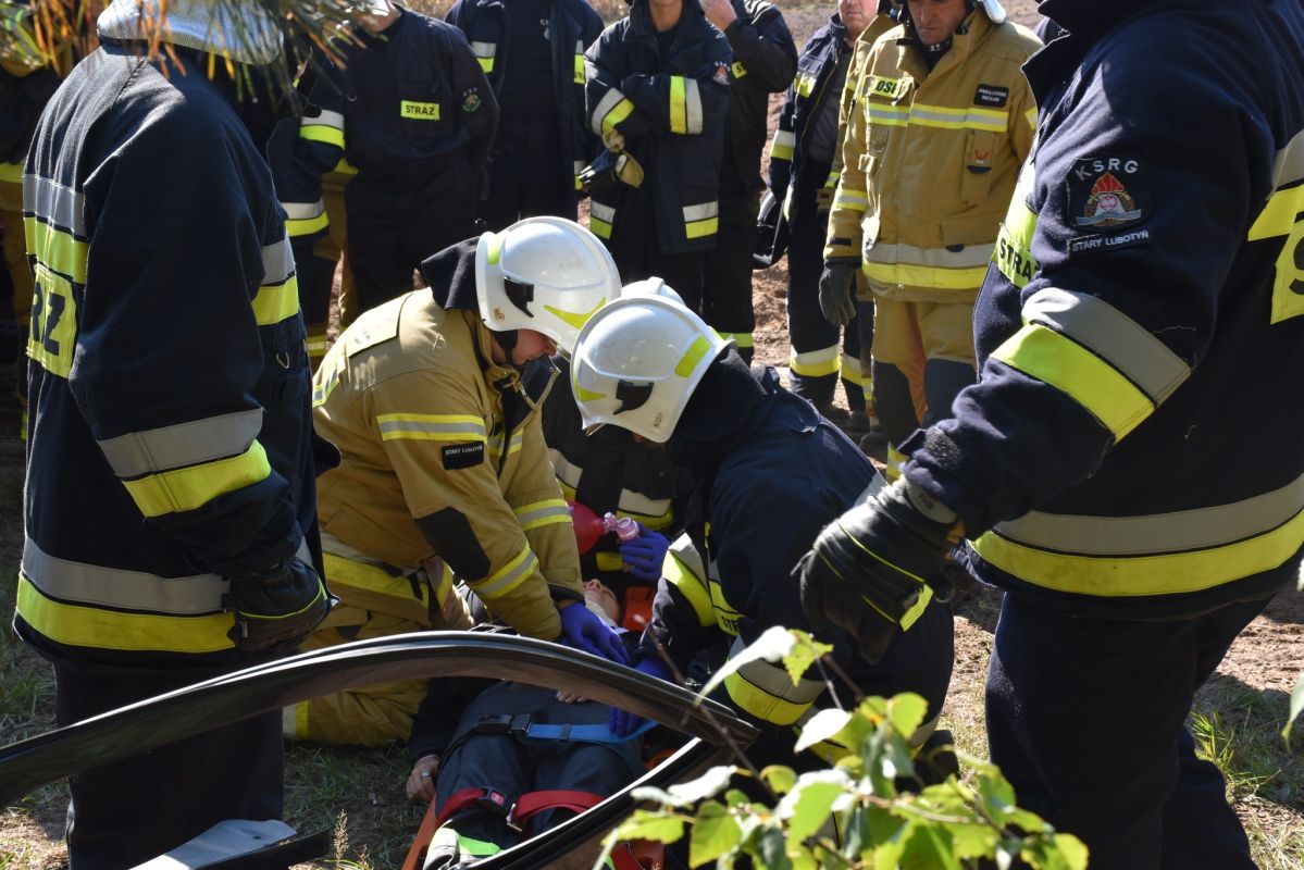 Wypadek samochodu przyczyną pożaru lasu w okolicach Gniazdowa , symulowane zdarzenie (25.09.2022) - Zdjęcie 13/68