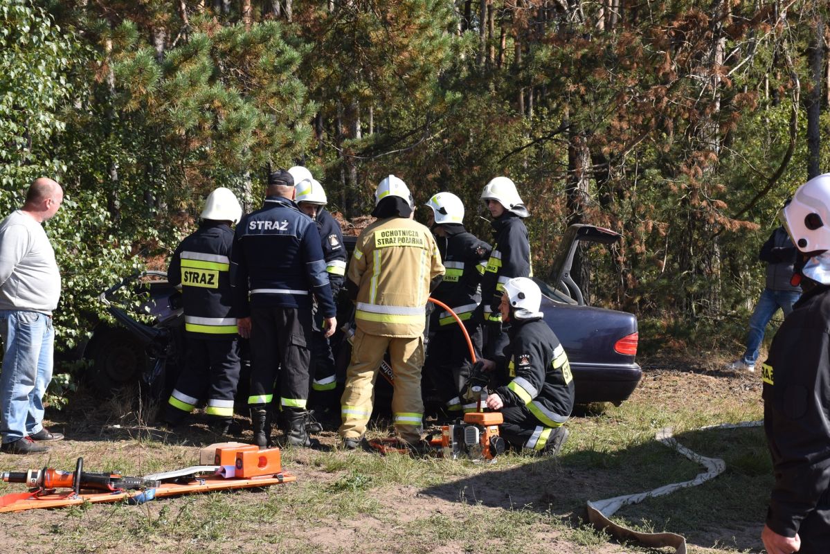Wypadek samochodu przyczyną pożaru lasu w okolicach Gniazdowa , symulowane zdarzenie (25.09.2022) - Zdjęcie 14/68