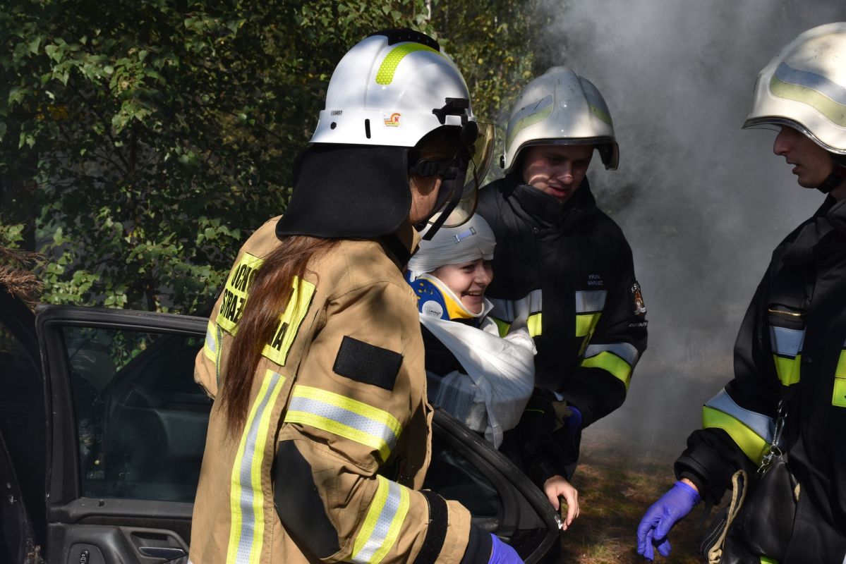 Wypadek samochodu przyczyną pożaru lasu w okolicach Gniazdowa , symulowane zdarzenie (25.09.2022) - Zdjęcie 44/68