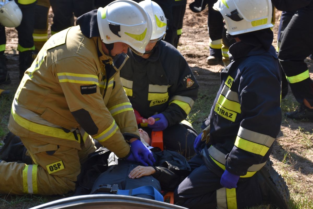 Wypadek samochodu przyczyną pożaru lasu w okolicach Gniazdowa , symulowane zdarzenie (25.09.2022) - Zdjęcie 57/68