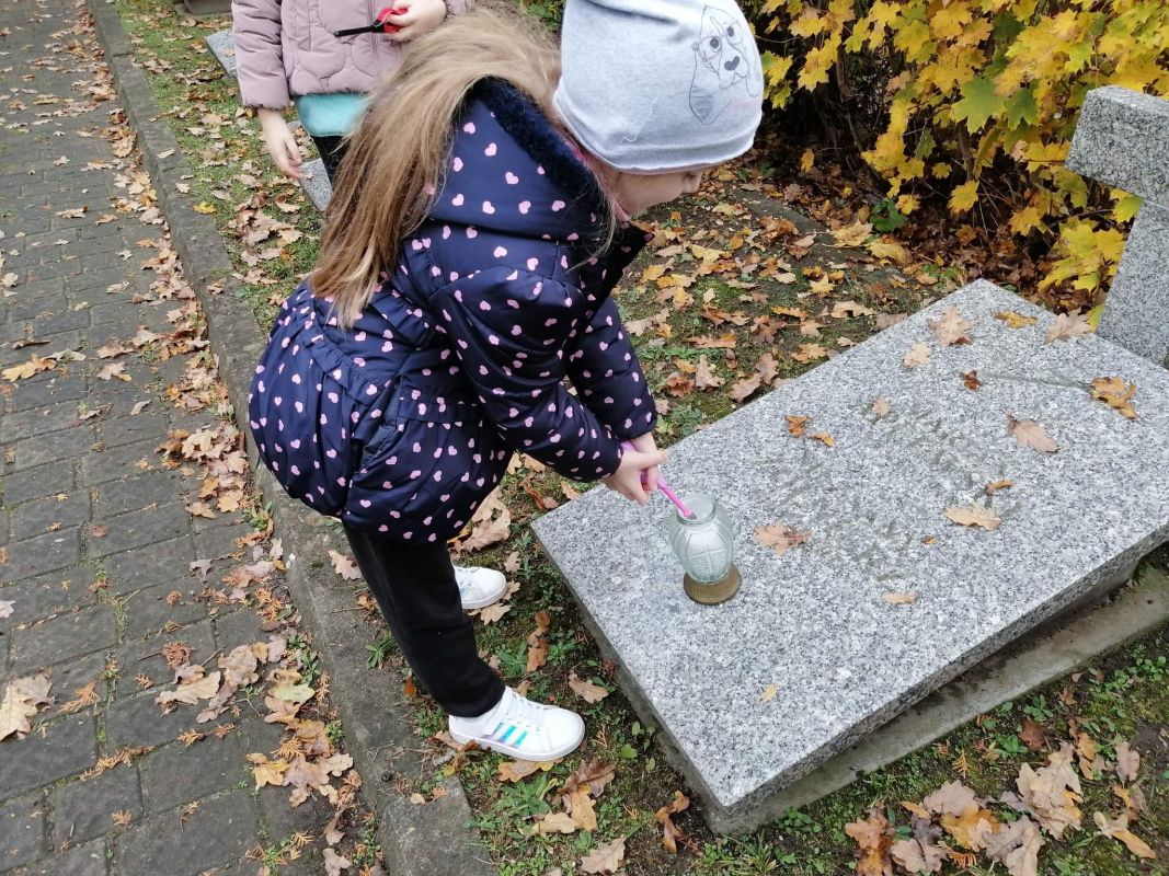 Uczniowie ze Szkoły Podstawowej Nr 2 zapalili znicze na mogiłach żołnierskich (28.10.2022) - Zdjęcie 24/28