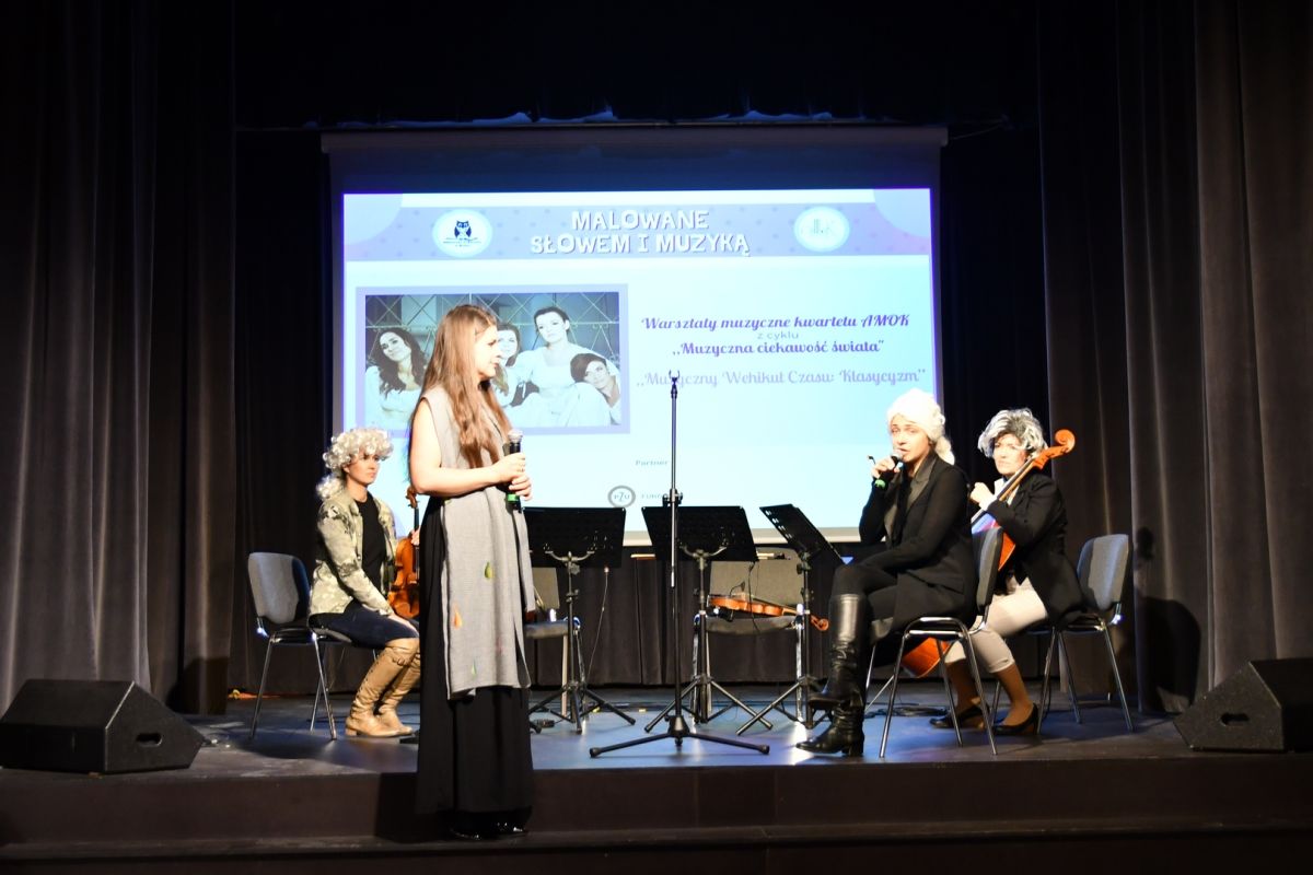 Warsztaty muzyczne dla dzieci, prowadzone przez damski kwartet muzyczny "Amok", na Sali Widowiskowej, przy ul. Pułtuskiej 22 w Broku.