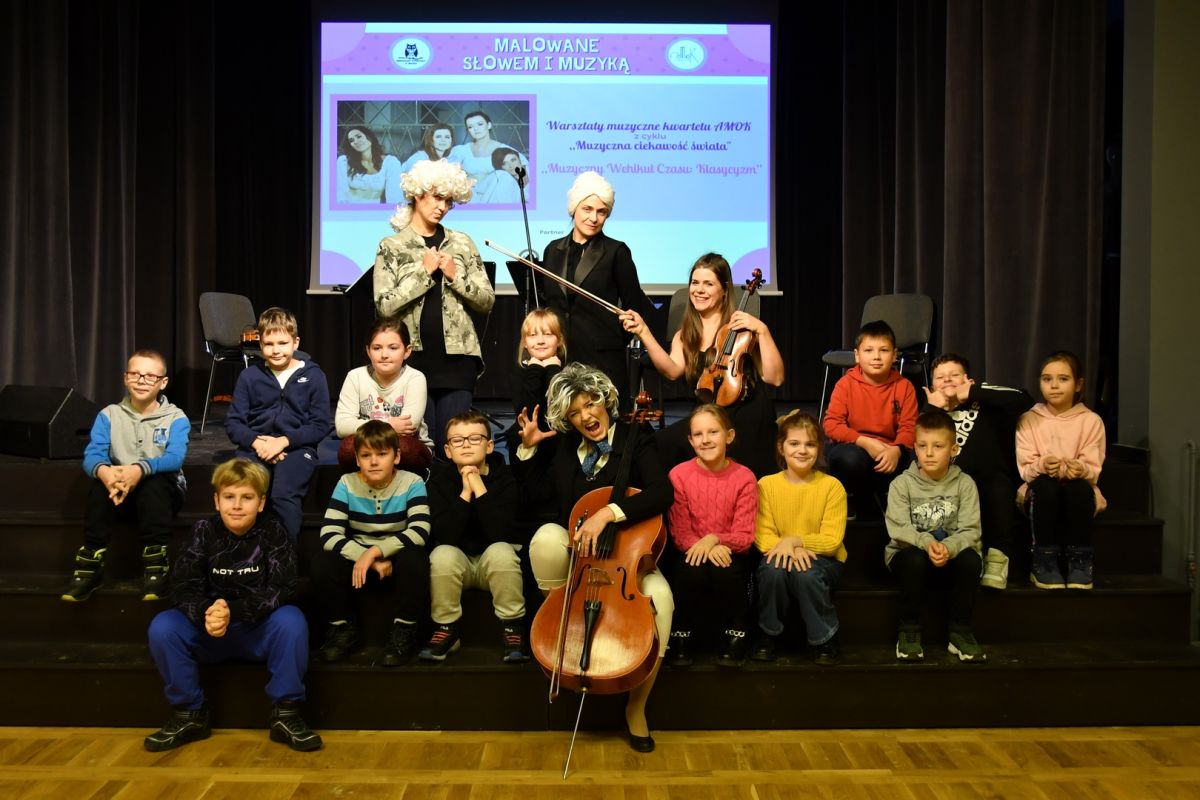 Warsztaty muzyczne dla dzieci, prowadzone przez damski kwartet muzyczny "Amok", na Sali Widowiskowej, przy ul. Pułtuskiej 22 w Broku.
