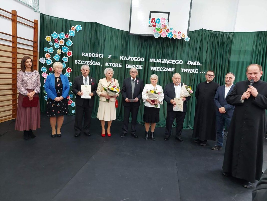 50 lat temu, 3 pary z gminy Zaręby Kościelne stanęło na ślubnym kobiercu. Z tej okazji w środę, 23 listopada 2022, w Szkole Podstawowej w Zarębach Kościelnych odbyła się uroczystość Złotych Godów.
