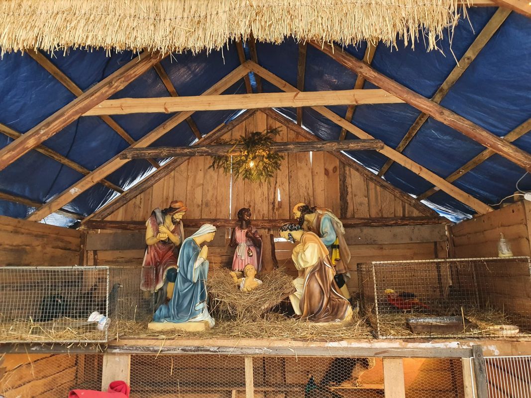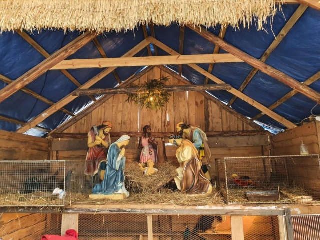 Szopka bożonarodzeniowa z udziałem żywych zwierząt w Małkini Górnej, wystawiona z okazji świąt Bożego Narodzenia 2022.