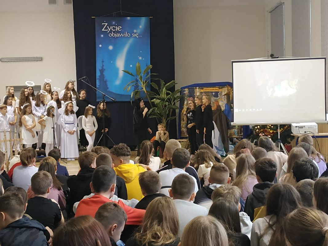 Jasełka w wykonaniu uczniów - głównie klas czwartych - pod kierunkiem ks. Wojciecha Kuraka.