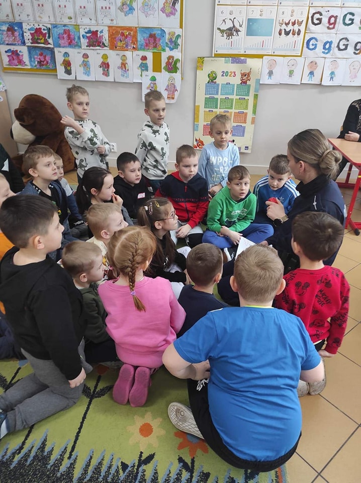 Policjantka z KPP Ostrów Mazowiecka odwiedziła szkołę w Dybkach i przypomniała dzieciom zasady bezpiecznego zachowania podczas ferii zimowych.