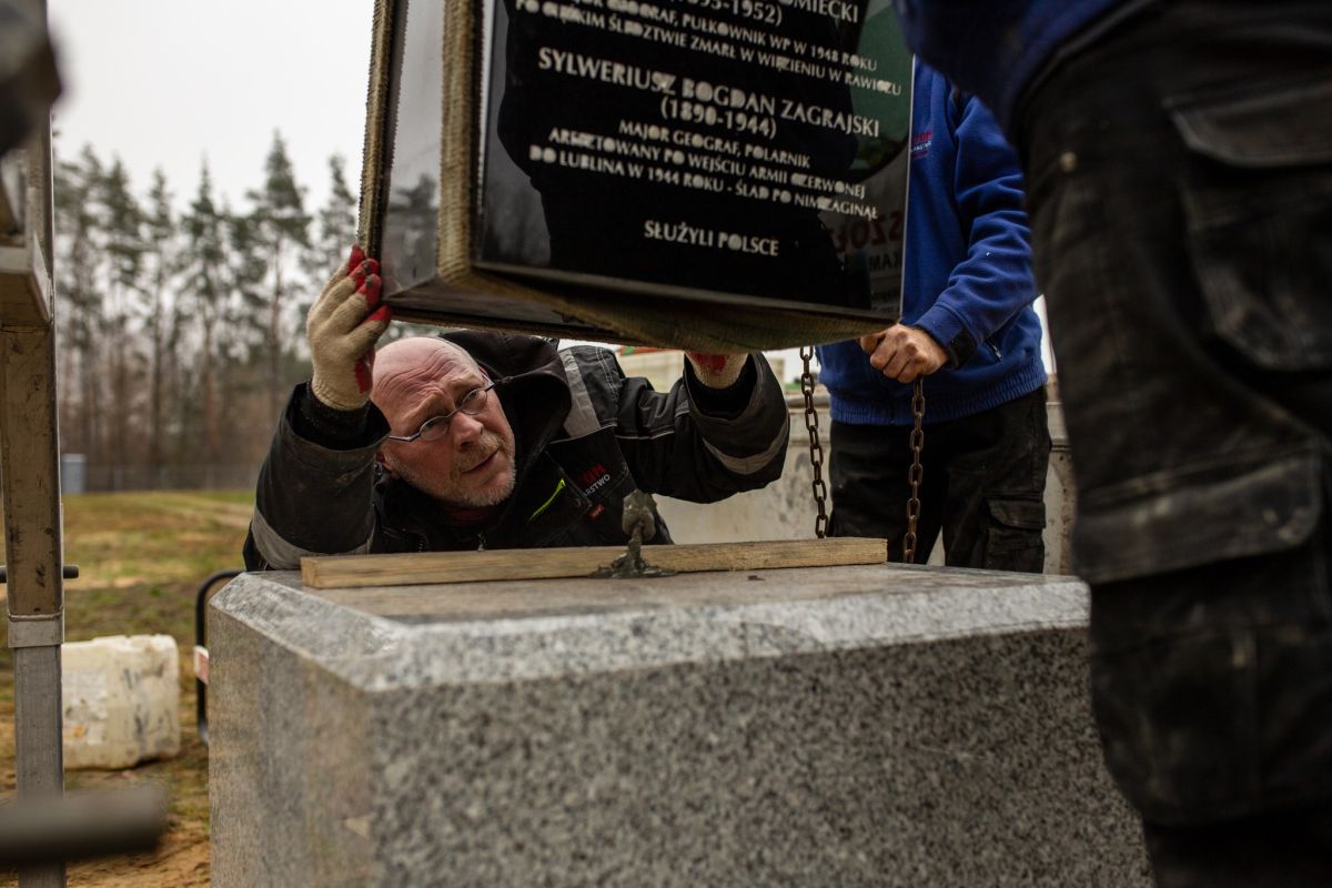 Reportaż zdjęciowy z montażu pomnika oraz uroczystości jego odsłonięcia podczas Święta Geografii Wojskowej