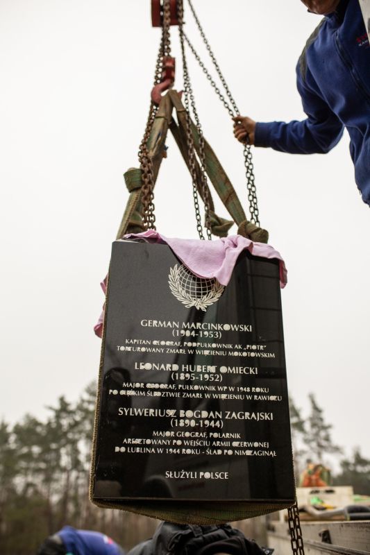 Reportaż zdjęciowy z montażu pomnika oraz uroczystości jego odsłonięcia podczas Święta Geografii Wojskowej