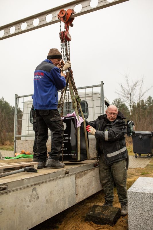 Reportaż zdjęciowy z montażu pomnika oraz uroczystości jego odsłonięcia podczas Święta Geografii Wojskowej