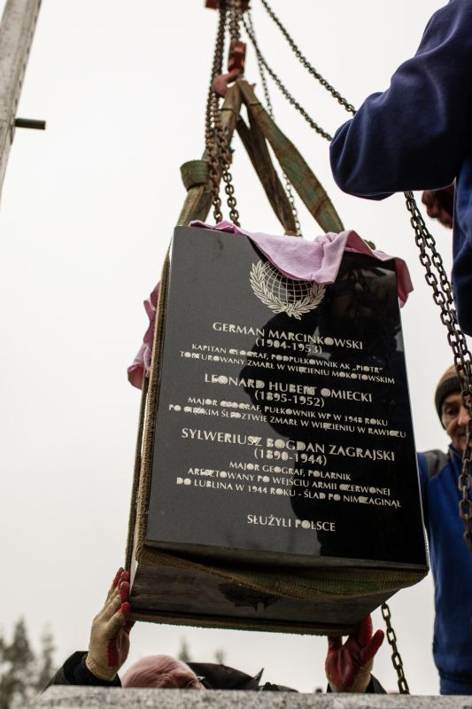 Reportaż zdjęciowy z montażu pomnika oraz uroczystości jego odsłonięcia podczas Święta Geografii Wojskowej
