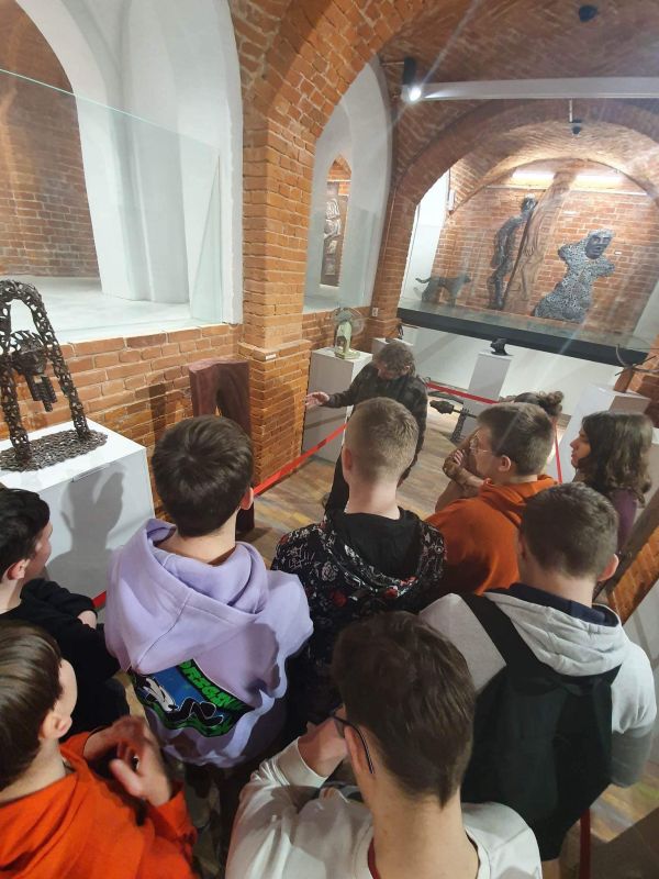 Uczniowie "Ekonomika" zwiedzają wystawę rzeźb i assemblage Artura Szydlika (10.03.2023) - Zdjęcie 4/17