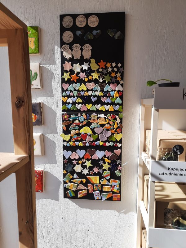 Rękodzieła wytworzone w trzech pracowniach fundacji: ceramicznej, cukierniczej i rzeźbiarskiej.