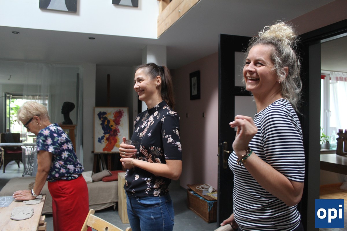 Uczestniczki warsztatów na matrycy z linoleum rzeźbiły twarz kobiety, odbijały ją w glinie, malowały glinkami do ceramiki.