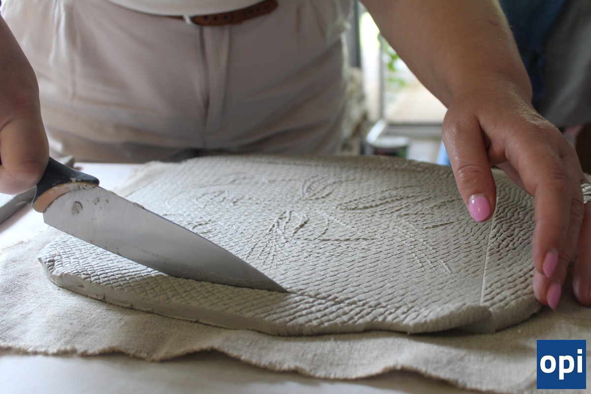 Uczestniczki warsztatów na matrycy z linoleum rzeźbiły twarz kobiety, odbijały ją w glinie, malowały glinkami do ceramiki.