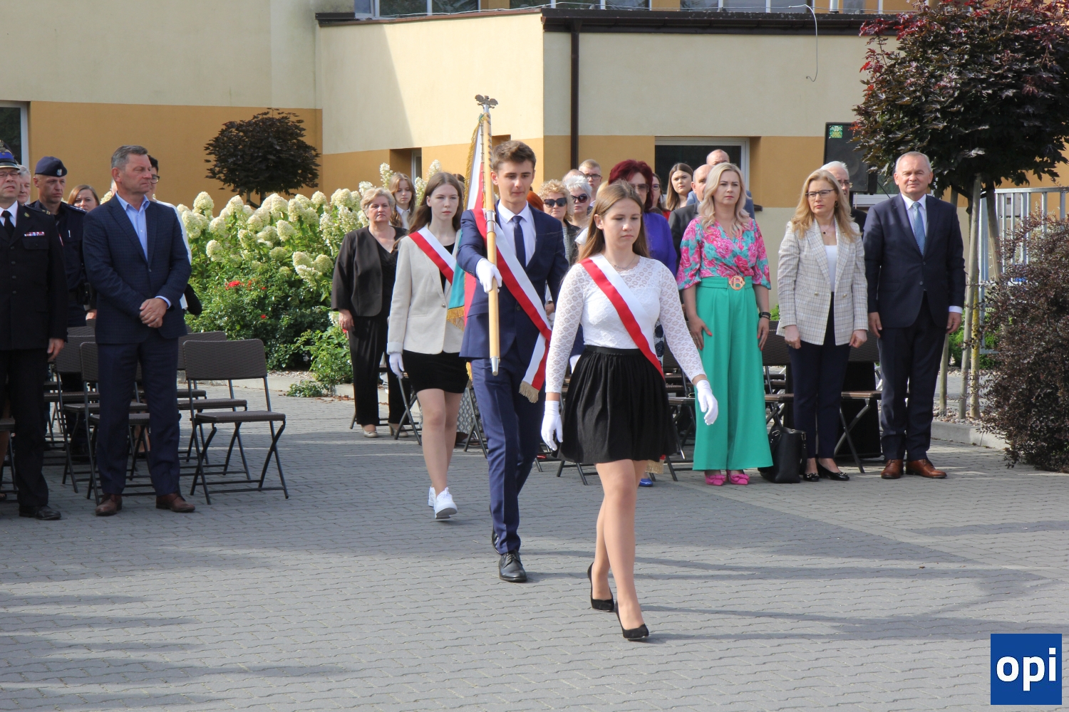 Uroczysta inauguracja roku szkolnego 2023/2024 odbyła się przed głównym wejściem do szkoły, przy pięknej pogodzie.