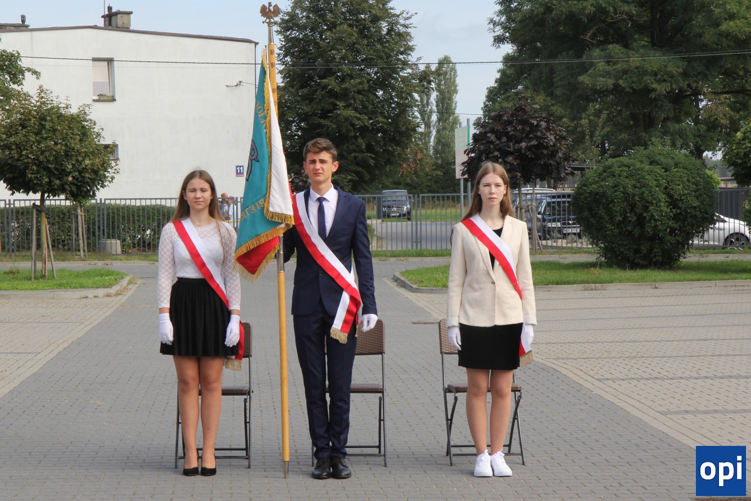 Uroczysta inauguracja roku szkolnego 2023/2024 odbyła się przed głównym wejściem do szkoły, przy pięknej pogodzie.