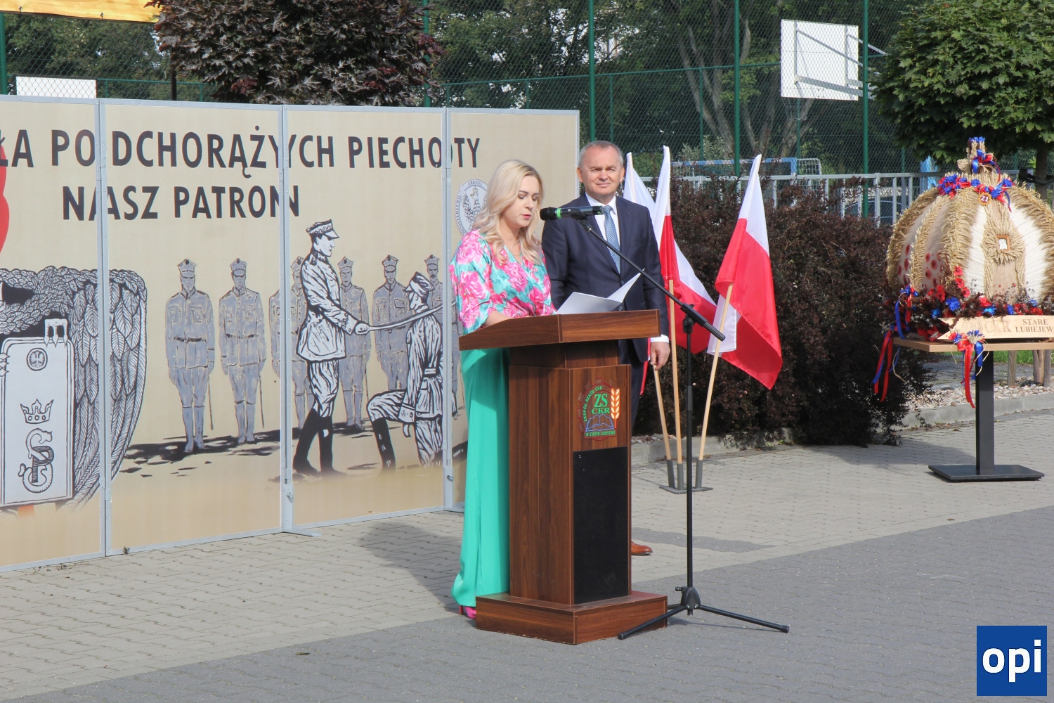 Uroczysta inauguracja roku szkolnego 2023/2024 odbyła się przed głównym wejściem do szkoły, przy pięknej pogodzie.