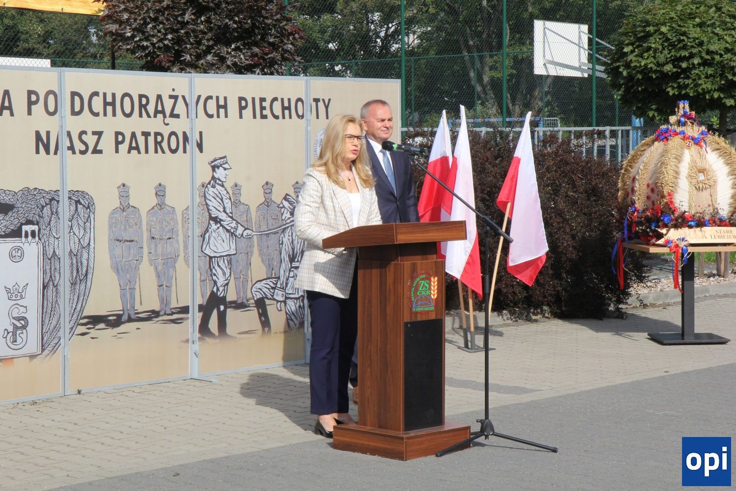 Uroczysta inauguracja roku szkolnego 2023/2024 odbyła się przed głównym wejściem do szkoły, przy pięknej pogodzie.