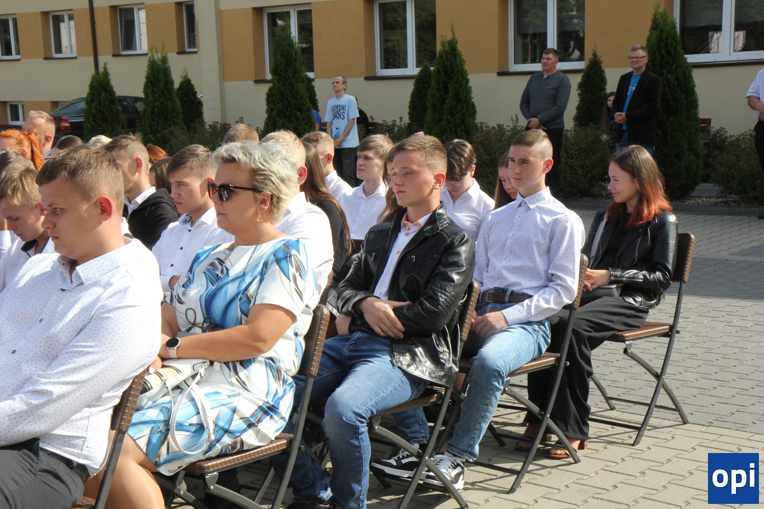 Uroczysta inauguracja roku szkolnego 2023/2024 odbyła się przed głównym wejściem do szkoły, przy pięknej pogodzie.
