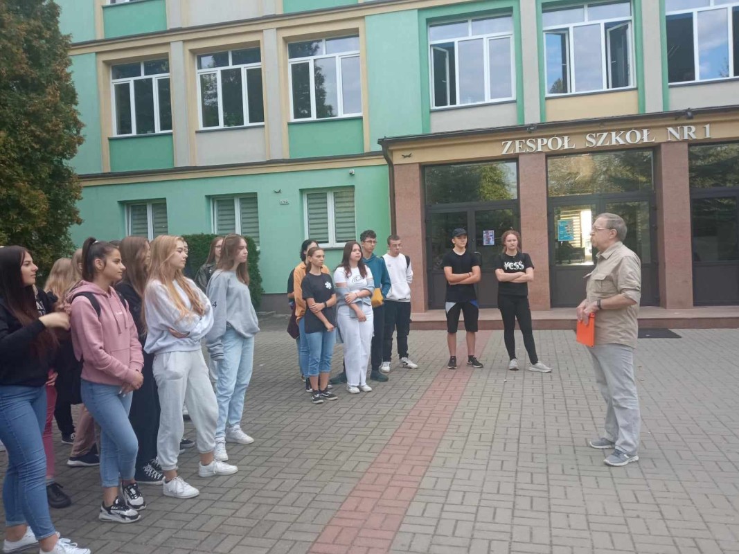 Uczniowie "Rubinka" poznają historię miasta podczas spacerów z pasjonatem lokalnych ciekawostek Andrzejem Mierzwińskim.