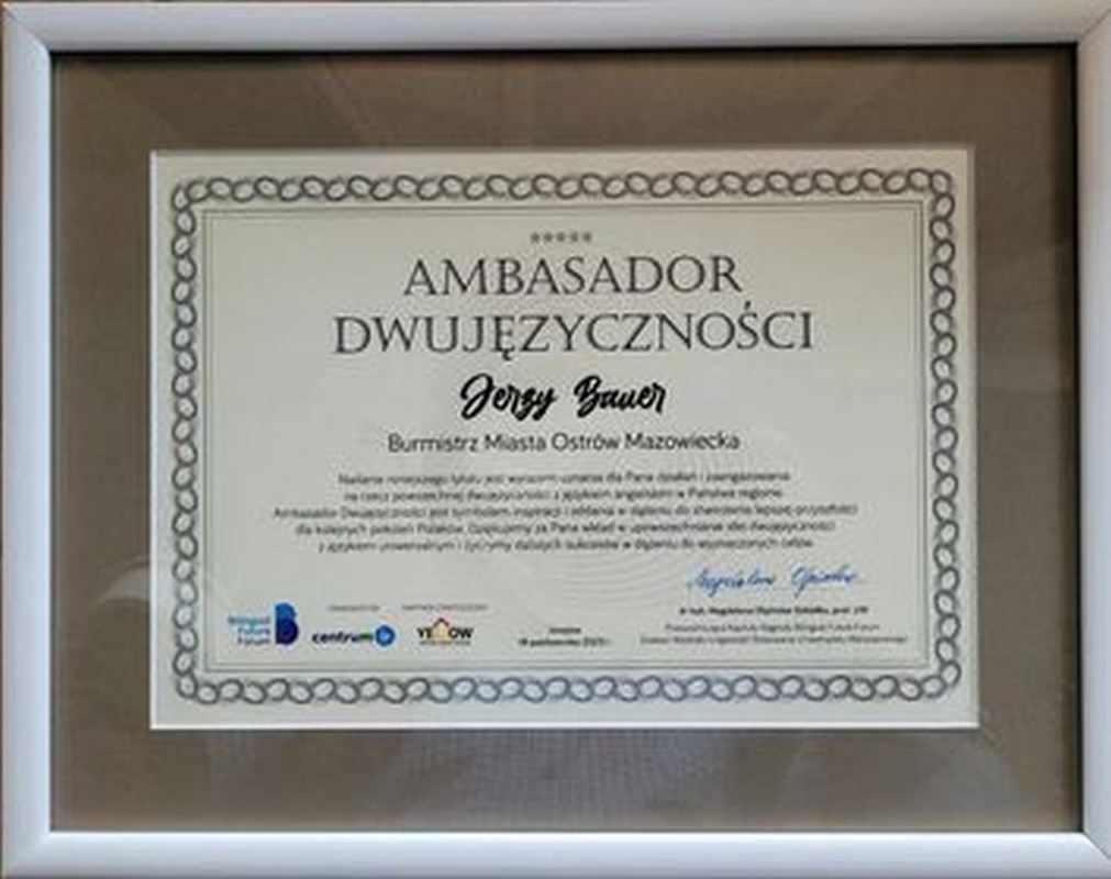 Burmistrz Ostrowi Mazowieckiej otrzymał tytuł Ambasadora Dwujęzyczności (18.10.2023) - Zdjęcie 4/8