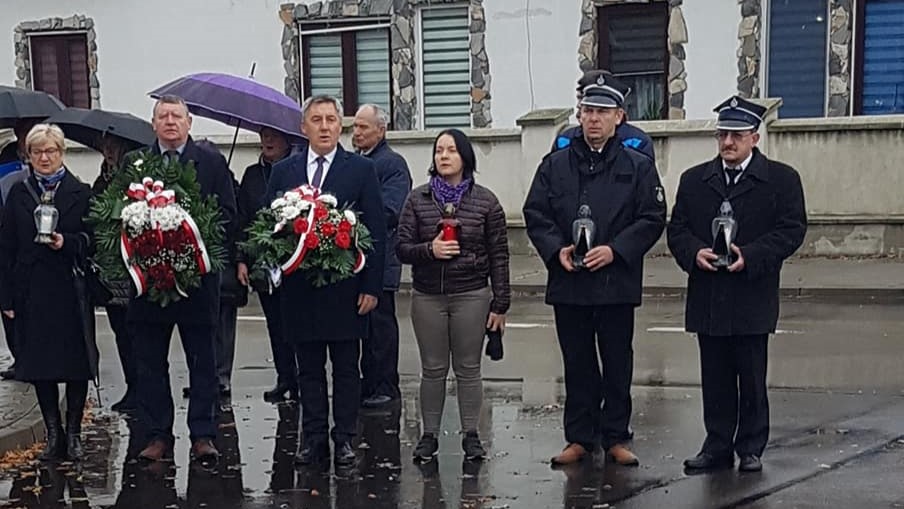 Symboliczne złożenie wieńców i zapalenie zniczy przed obeliskiem przez delegacje z gminy Wąsewo.
