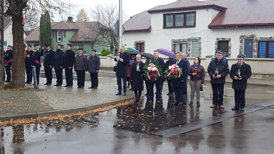 Symboliczne złożenie wieńców i zapalenie zniczy przed obeliskiem przez delegacje z gminy Wąsewo.