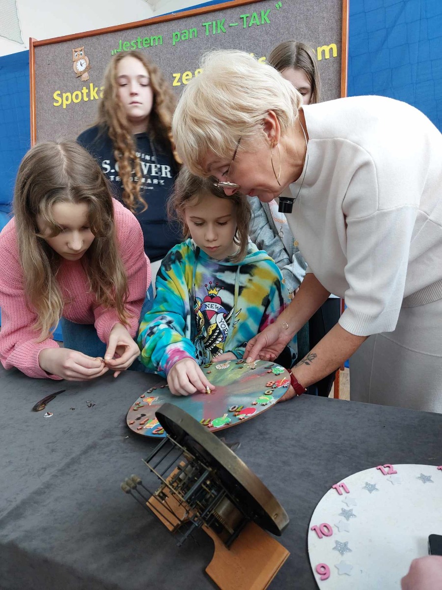 Spotkanie uczniów z zegarmistrzynią Dorotą Aleksandrowicz, z Pracowni Zegarmistrzowskiej i Metaloplastycznej w Ostrowi Mazowieckiej.