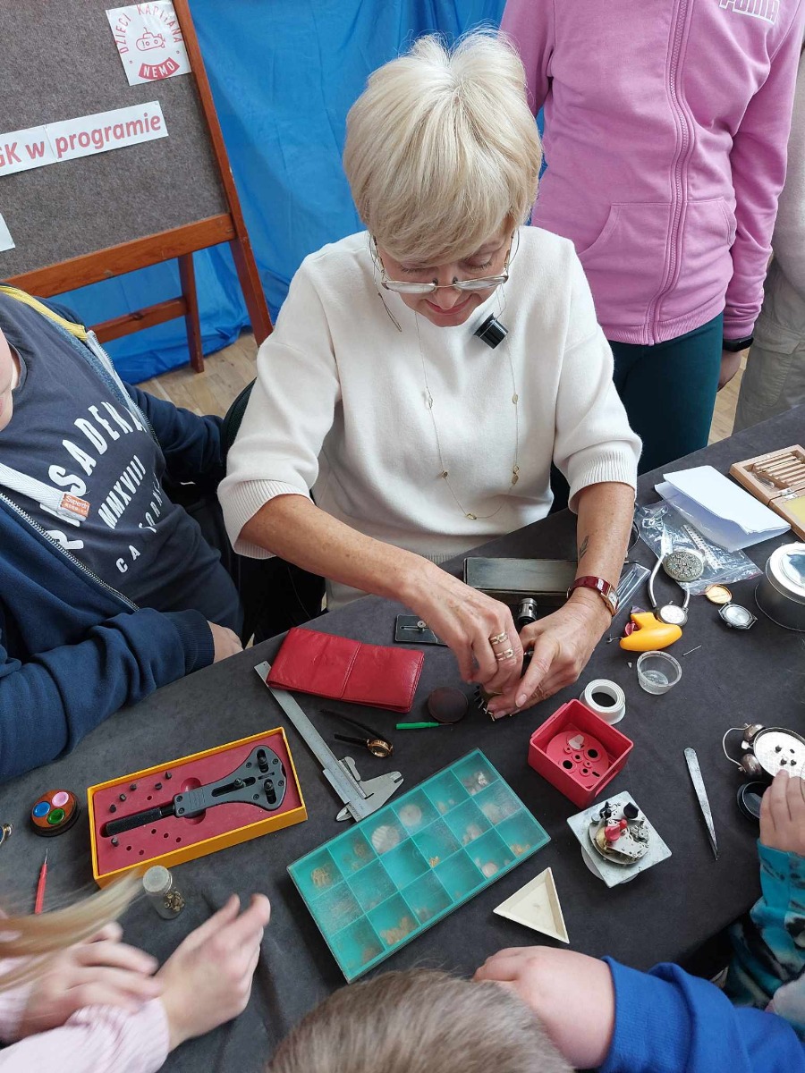 Spotkanie uczniów z zegarmistrzynią Dorotą Aleksandrowicz, z Pracowni Zegarmistrzowskiej i Metaloplastycznej w Ostrowi Mazowieckiej.