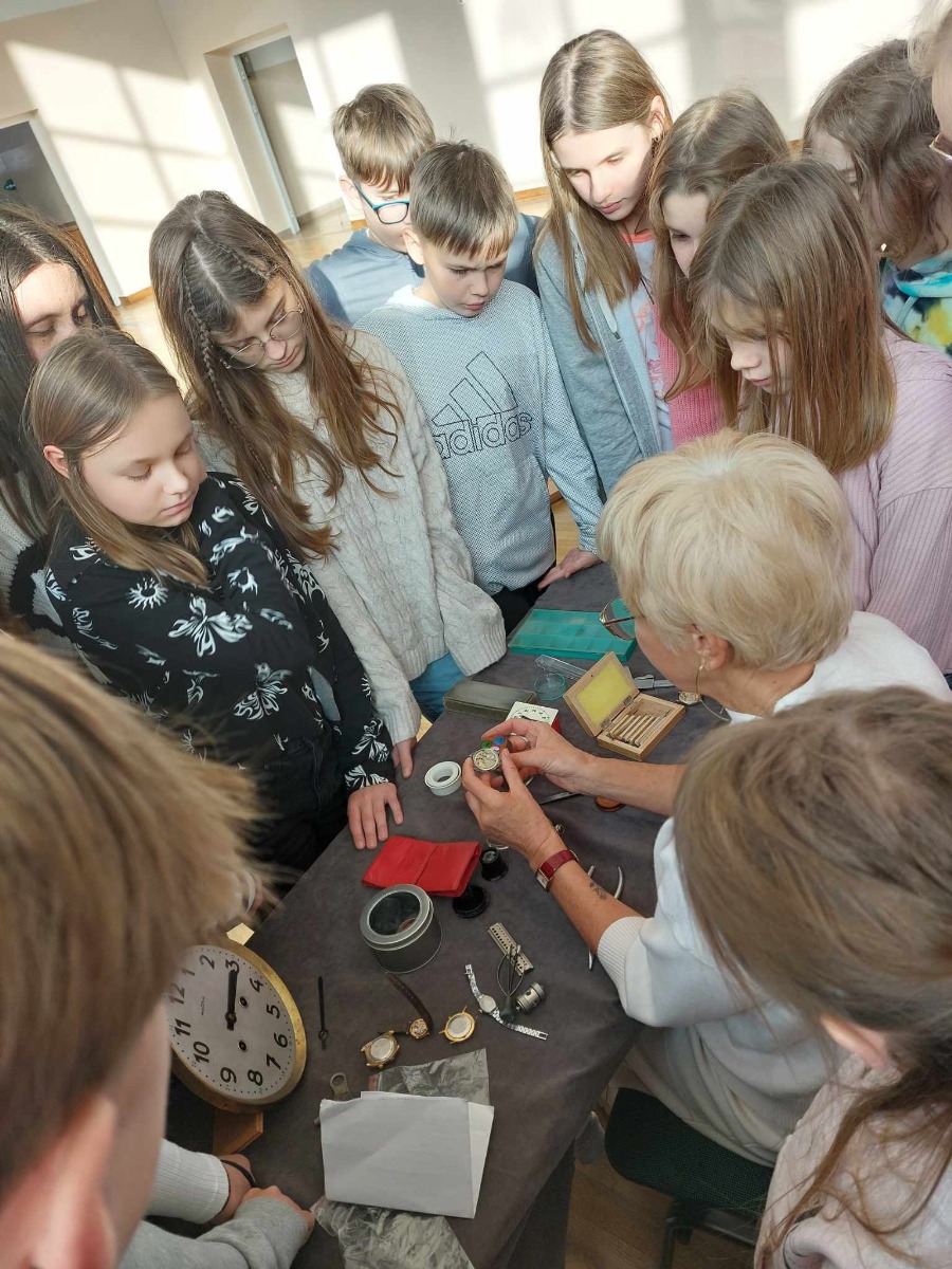 Spotkanie uczniów z zegarmistrzynią Dorotą Aleksandrowicz, z Pracowni Zegarmistrzowskiej i Metaloplastycznej w Ostrowi Mazowieckiej.