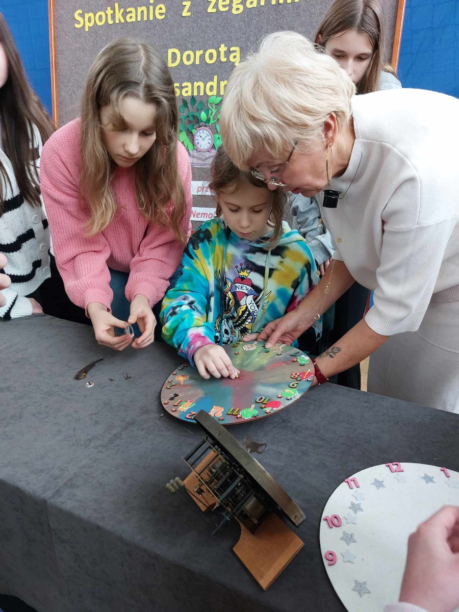 Spotkanie uczniów z zegarmistrzynią Dorotą Aleksandrowicz, z Pracowni Zegarmistrzowskiej i Metaloplastycznej w Ostrowi Mazowieckiej.