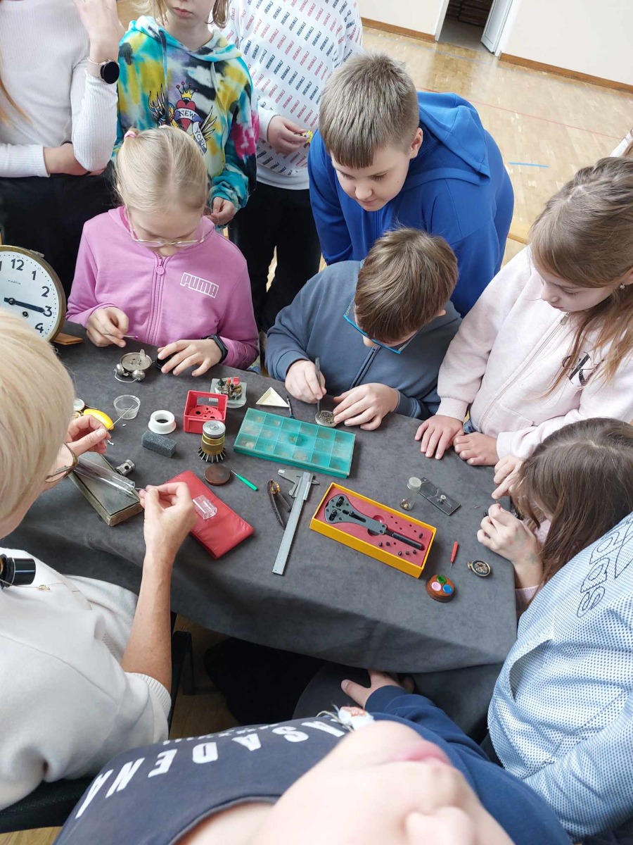 Spotkanie uczniów z zegarmistrzynią Dorotą Aleksandrowicz, z Pracowni Zegarmistrzowskiej i Metaloplastycznej w Ostrowi Mazowieckiej.