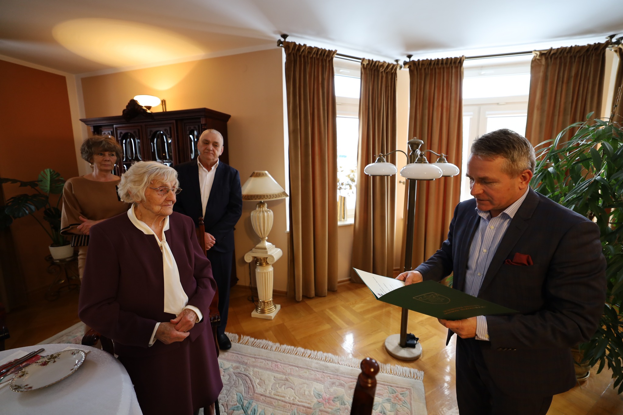 Odwiedzin jubilatki dokonali: burmistrz Jerzy Bauer, zastępczyni kierownika Urzędu Stanu Cywilnego Beata Rewkowska oraz przedstawicielki ZUS Inspektoratu w Ostrowi Mazowieckiej: Aneta Frąckiewicz i Agnieszka Kukawka.