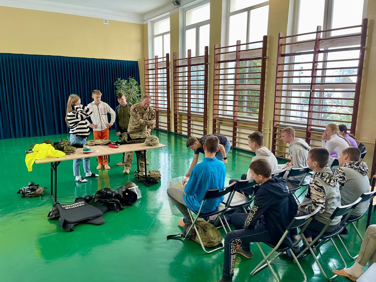 W trakcie spotkania uczniowie poznali specyfikę służby w Żandarmerii Wojskowej, ponadto zapoznali się ze sprzętem wojskowym.