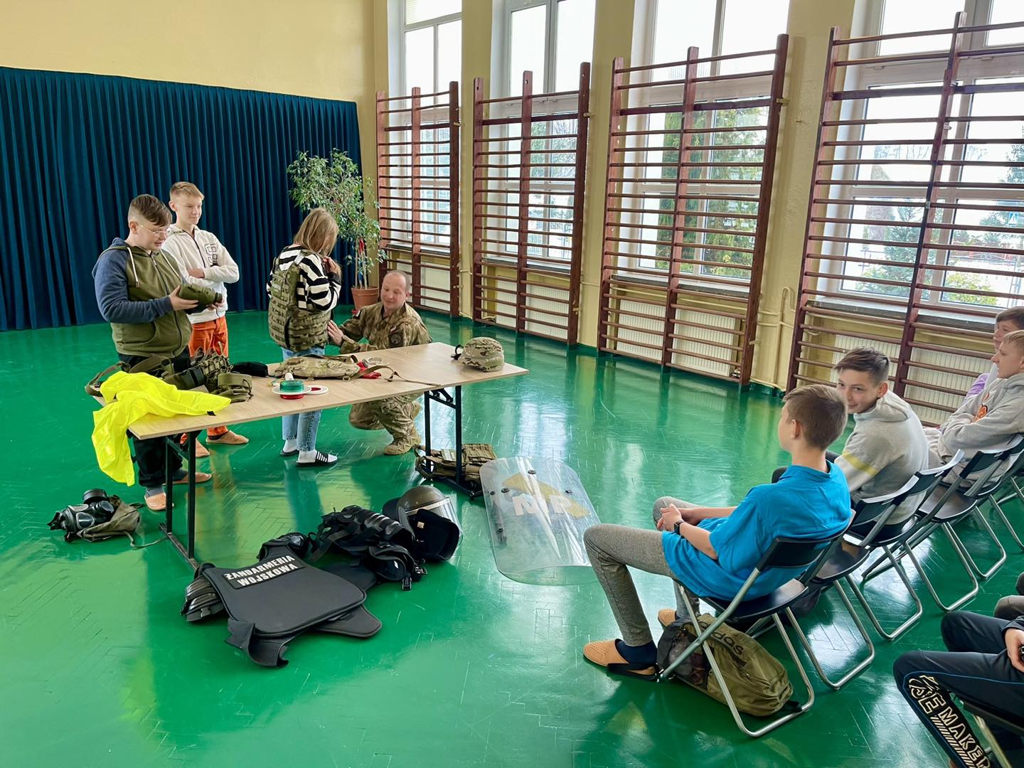 W trakcie spotkania uczniowie poznali specyfikę służby w Żandarmerii Wojskowej, ponadto zapoznali się ze sprzętem wojskowym.