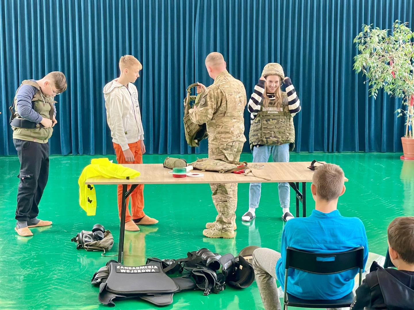 W trakcie spotkania uczniowie poznali specyfikę służby w Żandarmerii Wojskowej, ponadto zapoznali się ze sprzętem wojskowym.