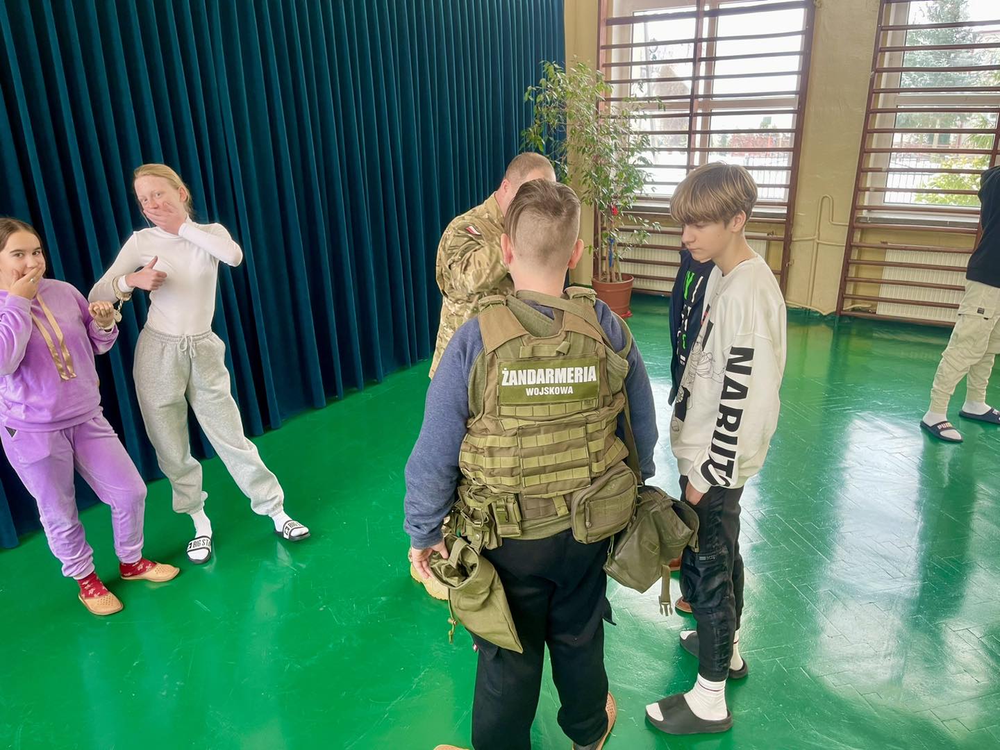 W trakcie spotkania uczniowie poznali specyfikę służby w Żandarmerii Wojskowej, ponadto zapoznali się ze sprzętem wojskowym.