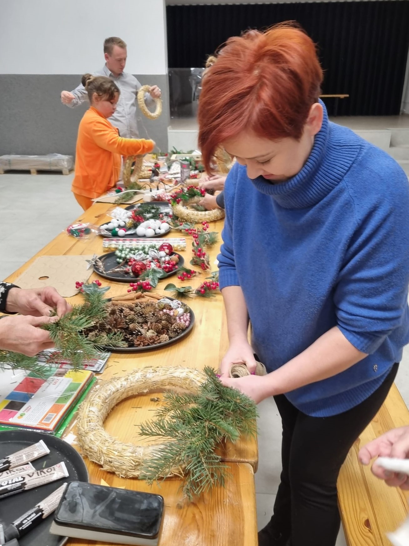 Podczas warsztatów przy dźwiękach świątecznych piosenek, powstały piękne bożonarodzeniowe wianki i inne dekoracje.