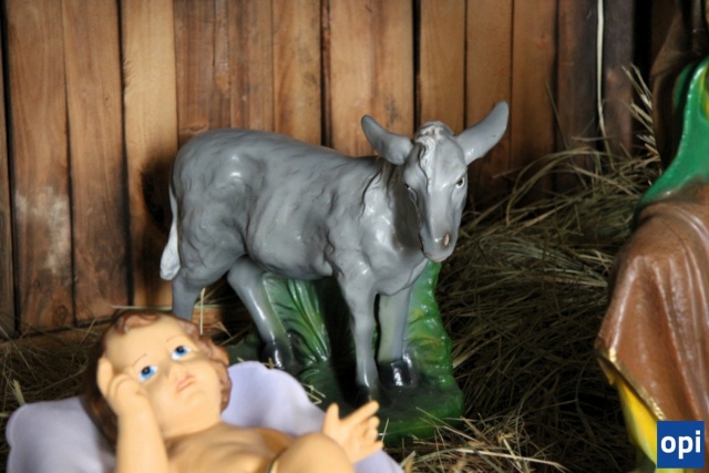 Tradycyjna szopka z okazji świąt Bożego Narodzenia. Co ciekawe, osioł ma słodycze dla najmłodszych.