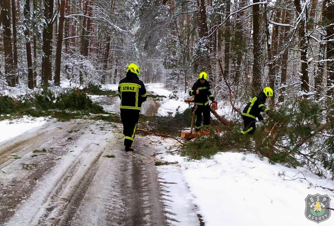 Interwencje strażaków dotyczyły zatarasowanych przez powalone drzewa dróg i szklaków komunikacyjnych na terenie gminy Boguty-Pianki.