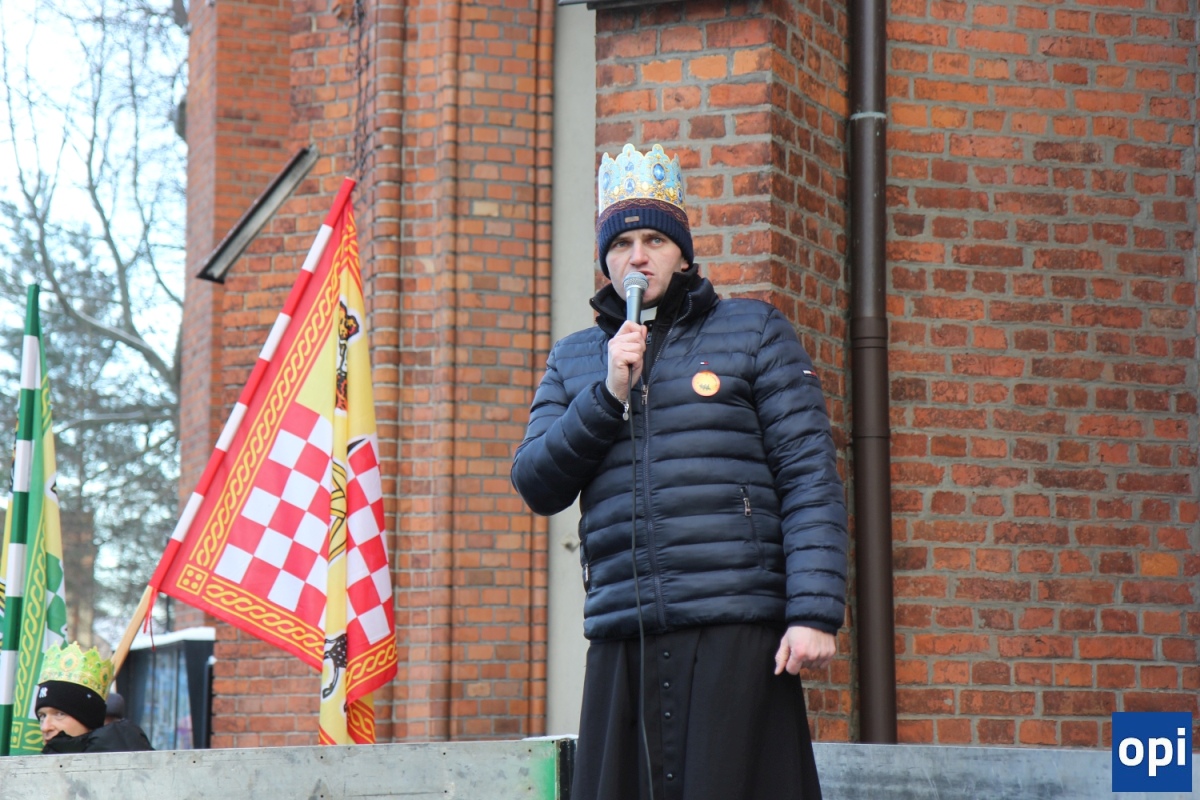 Baltazar, Kacper i Melchior prowadzeni przez gwiazdę betlejemską, a za nimi tłum mieszkańców Ostrowi Mazowieckiej, na trasie kościół pw. WNMP - kościół pw. Chrystusa Dobrego Pasterza.