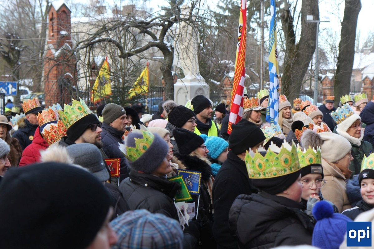 Baltazar, Kacper i Melchior prowadzeni przez gwiazdę betlejemską, a za nimi tłum mieszkańców Ostrowi Mazowieckiej, na trasie kościół pw. WNMP - kościół pw. Chrystusa Dobrego Pasterza.