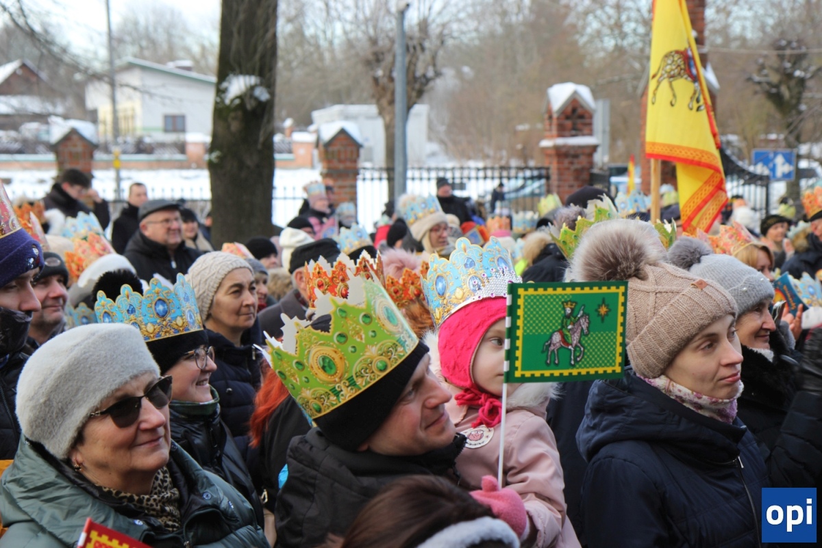 Baltazar, Kacper i Melchior prowadzeni przez gwiazdę betlejemską, a za nimi tłum mieszkańców Ostrowi Mazowieckiej, na trasie kościół pw. WNMP - kościół pw. Chrystusa Dobrego Pasterza.
