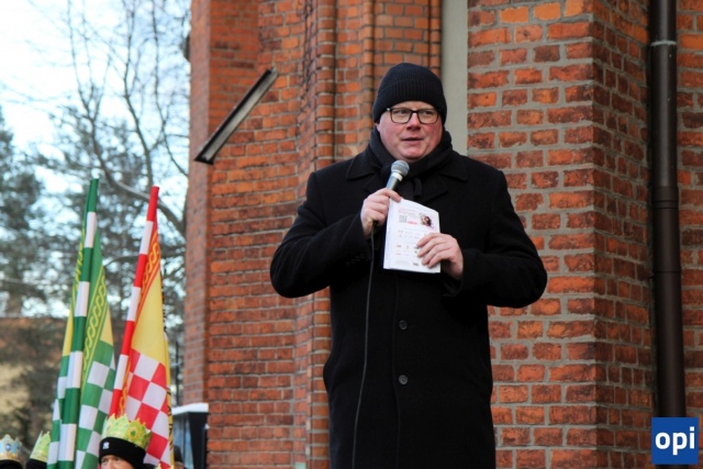 Baltazar, Kacper i Melchior prowadzeni przez gwiazdę betlejemską, a za nimi tłum mieszkańców Ostrowi Mazowieckiej, na trasie kościół pw. WNMP - kościół pw. Chrystusa Dobrego Pasterza.