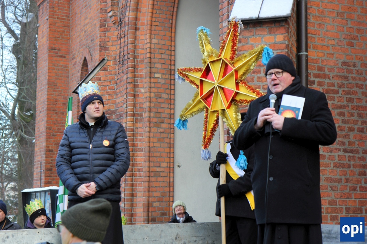 Baltazar, Kacper i Melchior prowadzeni przez gwiazdę betlejemską, a za nimi tłum mieszkańców Ostrowi Mazowieckiej, na trasie kościół pw. WNMP - kościół pw. Chrystusa Dobrego Pasterza.