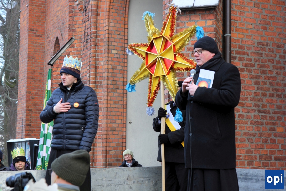Baltazar, Kacper i Melchior prowadzeni przez gwiazdę betlejemską, a za nimi tłum mieszkańców Ostrowi Mazowieckiej, na trasie kościół pw. WNMP - kościół pw. Chrystusa Dobrego Pasterza.