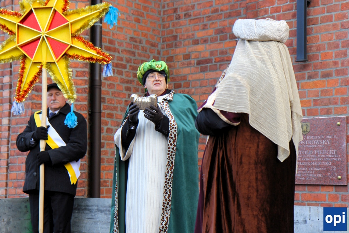Baltazar, Kacper i Melchior prowadzeni przez gwiazdę betlejemską, a za nimi tłum mieszkańców Ostrowi Mazowieckiej, na trasie kościół pw. WNMP - kościół pw. Chrystusa Dobrego Pasterza.
